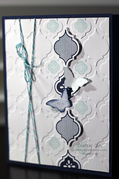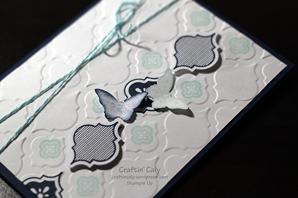 I wanted to make it a little more masculine by choosing a darker color. The cardstock and ink is in Night of Navy and the lighter blue color is Soft Sky. I embossed the white cardstock first, then tried to line up my image over the embossed areas as best I could. I also stamped some on white scraps and punched them out – along with some butterflies using the Bitty Butterfly punch after sponging the edges with some ink to give it more definition. There was a lot of space on the left side so I added some twine to finish off the card.