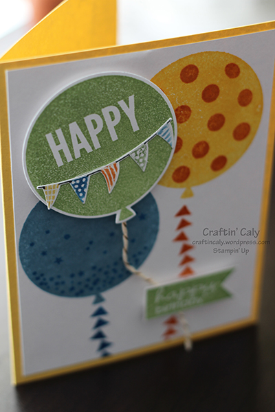 Anyway – today’s card is from the Celebrate Today kit! So cute. It comes with matching dies and I had to use them! The colors I chose are Daffodil Delight and Pumpkin Pie for the orange balloon, Marina Mist and Pacific Point for the blue balloon, and Wild Wasabi for the green balloon and the happy birthday banner. The card base is in Daffodil Delight.