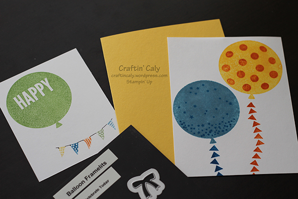 I used the lighter inks to stamp the balloons, then the darker inks to add the balloon decor. The green balloon and it’s banner was stamped on a separate piece of scrap paper so I could use my dies to cut them out. Once cut, I used Stampin’ Dimensionals (double-sided foam stickers) to prop up the image to give it a 3D effect.