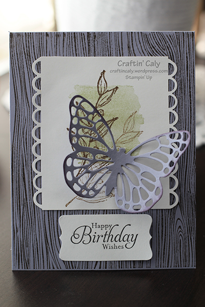 Stampin Up has new butterfly thinlits in their Spring catalog this year. OoOoh soooo pretty! It’s also sold in a bundle with a coordinating stamp set, which I made myself hold back on. So this card is made using two other stamp sets. The Pear Pizzazz background is from the For All Things stamp set and the sentiment and twig/leaf image is from the Simply Sketched stamp set, which is now retired.