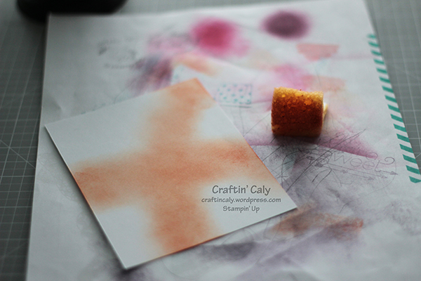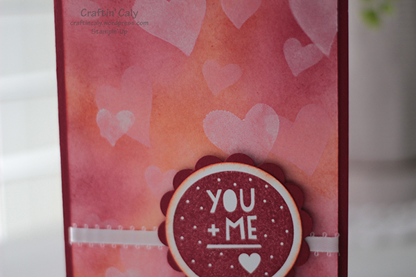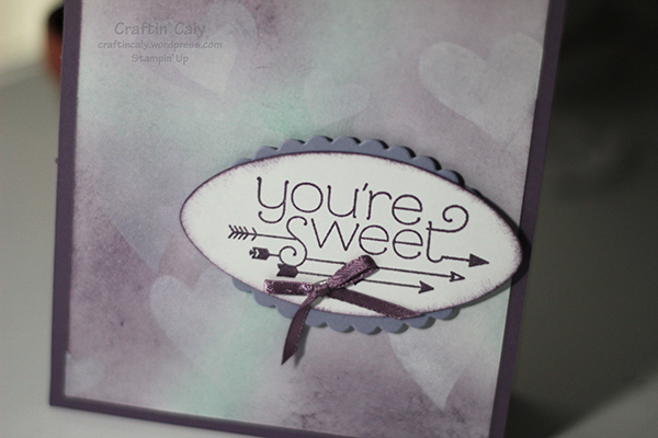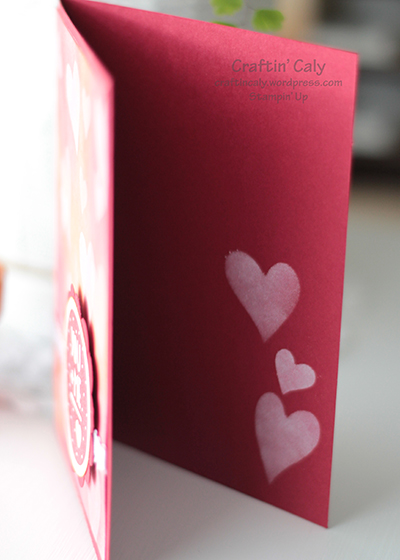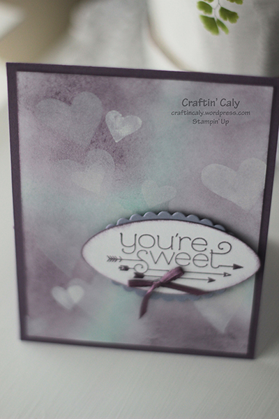 Then I sponged the rest in the main color. On this card, it’s Perfect Plum, which is also the color of the card base. I used heart framelits to cut out hearts in random places on a piece of heavy card stock in random places (3 to be exact) and started sponging the hearts in random places, at first more transparent and than more opaque to get the “bokeh” effect – like filters on a camera.