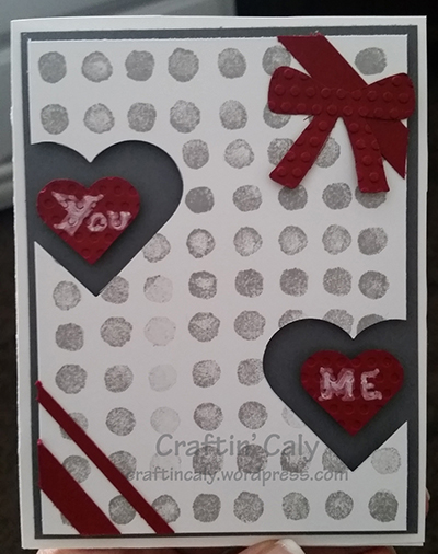 I’ve been working so much – my husband has not gotten a chance to get in my craft room to make a card for me. While I was working yesterday, he came in and made a card behind me while I was working my overtime. I think he did a great job! He used a stamp from the Painted Petals stamp set to create the dotted background and used some framelits to cut out the hearts. Isn’t he the sweetest?