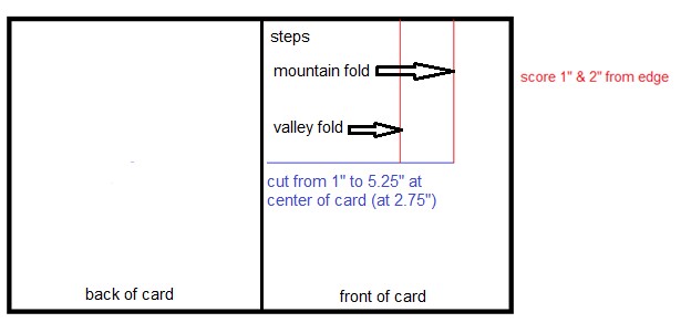 Once you’re done cutting, you’ll want turn your card stock clockwise and two score the right side of the previously cut line at 1″ and 2″. Here’s a diagram I created to help you visualize what I’m trying to say (click on the image to see a clearer/larger version):