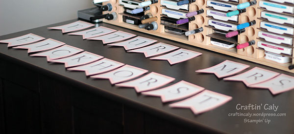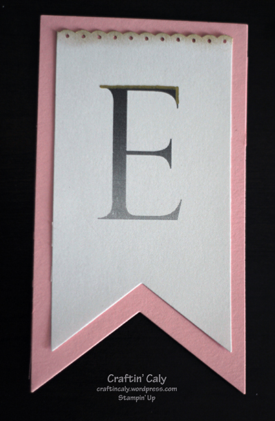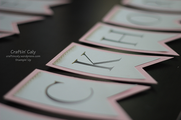 This entire project uses the Banners Framelits Die set. I used the largest die and cut out all the pieces for the base in Blushing Bride card stock. Then I printed the lettering on shimmer cardstock with an ombre fade text and cut them all in the next largest die. I used the same accented border punch and highlighted that with sponged Metallic Gold Encore Ink. I also tried to add some gold to the letters on each banner piece using a metallic gold marker, but you can barely see it. Here’s one of the banners up close and personal: