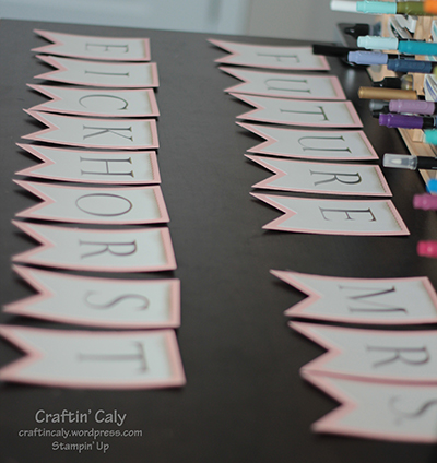 Two weeks ago, I wrote about making my friend Jessica’s bridal shower invites. Last week, one of the other bridesmaids asked me to make a banner to coordinate with those invites. I started with the same colors and incorporated as much as i could from the previous project. The only thing I did not add was the background lace image – I ran out of ink making the shower invites and have not ordered reinkers yet.