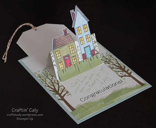 My upline Cindy has moved into her forever home – so I decided to make her a card to congratulate her. This card was so fun to make. It’s a slider card that I somewhat modified because I didn’t want some of the stamped images to move. The video I watched to create the card can be found here. I didn’t know how it was going to end up, but I just went with it and I think it turned out great!