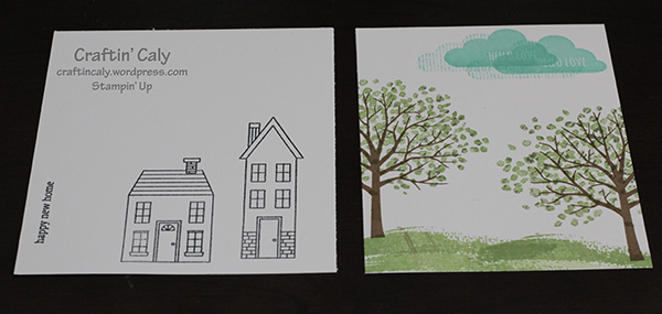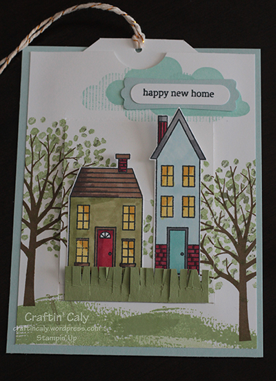 Since this card is a slider card, my base is just a 4.25″ x 5.5″ sheet using Soft Sky card stock. You could use a standard card base if you want the card to open for a greeting inside – but I didn’t think it was necessary for this card. For the slider base, I used a 4″ x 5.25″ sheet using Whisper White card stock. I stamped my trees and grass on this for the background image using the Sheltering Tree set, and used the cloud stamp from a kit called Hello Love. Β I made my cuts as described in the video, except I stopped before I cut into my clouds – I didn’t want these images to pop up in the slider portion of the card. For the slider/pop up portion of the card, I wanted to prop up some houses – so I used two images and the sentiment from a retired holiday set called Holiday Home.