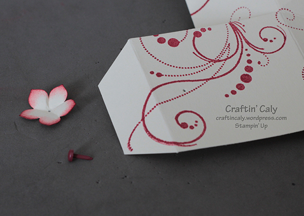 Start with a piece of card stock that is 7 3/8″ x 10 3/8″ – yes…sorry…these measurements are a bit unconventional – but it’s what worked! Stamp it to your heart’s content – I just used flourishes like Sam did in her video using Cherry Cobbler ink.