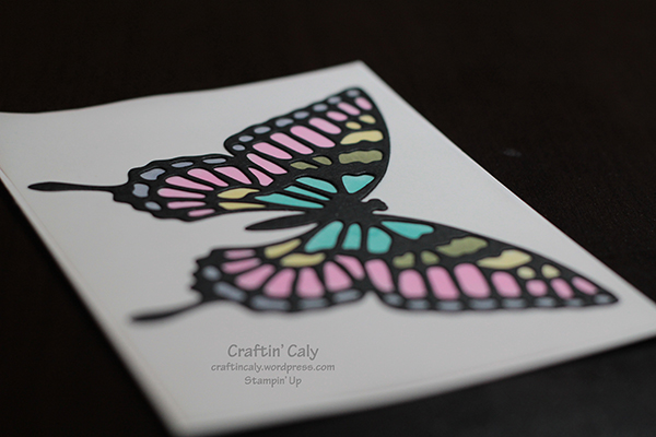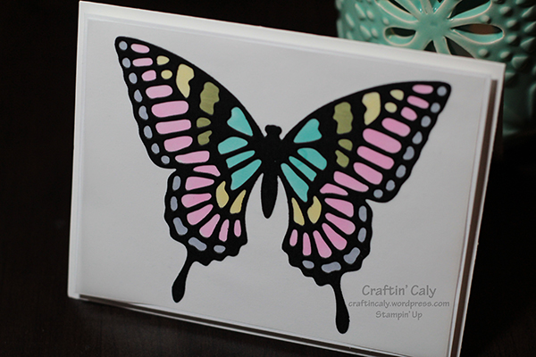 I played with my Blendabilities markers last night and made a quick card using vellum and the largest butterfly thinlit from the Butterflies Thinlits set (sorry, I can’t find the link for it!). I cut a piece of vellum to 4″ x 5 1/4″, cut out the butterfly image on Basic Black Card stock, and used Tombow Liquid Multipurpose Glue to carefully adhere the butterfly to the vellum. Once dry, I colored the back side of the vellum (if you put the project over some white/light colored paper, you can see easily through the vellum where you are coloring) with an assortment of Blendabilities markers. It’ so quick and easy! My oldest son watched me do this in less than 5 minutes.