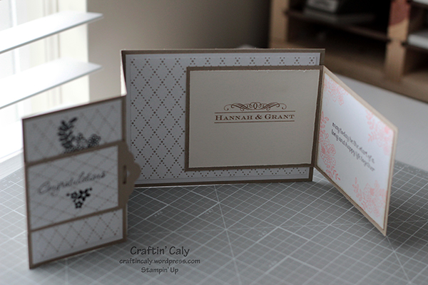 My friend Karen has mentioned many times that she tries to use something from the wedding invitation to incorporate into her cards, so I tried to do that here using the piece on the center of the card that says “Hannah & Grant” to personalize it a bit for the couple.