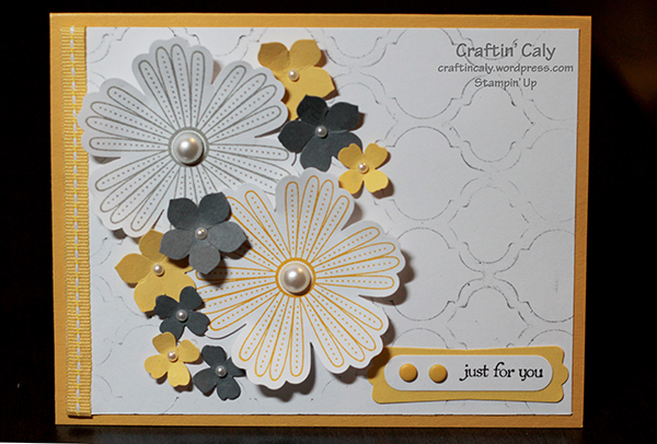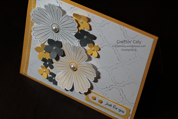 I have to admit – I’ve never made a card using these colors…. It’s never my first choice to choose a mustard yellow when choosing colors – for ANYTHING. But, being put to the challenge, I got busy. The card base is in Crushed Curry. I decided to use my Modern Mosaic Embossing Folder as a stamp. I inked up one side with black ink and tried to stamp it as best as I could on white cardstock. It didn’t leave a big impression, but I think it’s just enough to tie in the patterns from the inspiration photo.