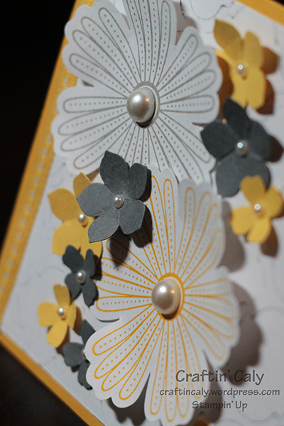 Then I stamped two blossom images from my Mixed Bunch set in Basic Gray ink and Daffodil Delight ink and punched them out with my Blossom Punch. Then using my Petite Petals Punch and my little flower punch from the Itty Bitty Accents Punch Pack, I punched out random pieces in Basic Gray and Daffodil Delight cardstock. I added some stitched ribbon in Daffodil Delight on the very end of my white cardstock and randomly adhered my flowers to the piece.