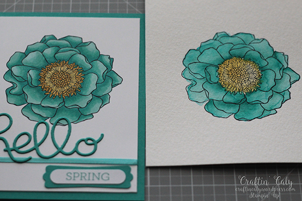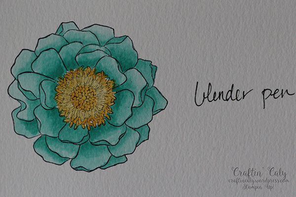 Unlike with Blendabilities markers, you’ll want to use watercolor paper with the blender pen and aqua painter. You also have to use Stazon permanent ink. If you don’t use a permanent ink to stamp your images, the image will bleed while you color. You want to keep a crisp image as you color. My samples are colored using the Blended Bloom stamp and Bermuda Bay ink.