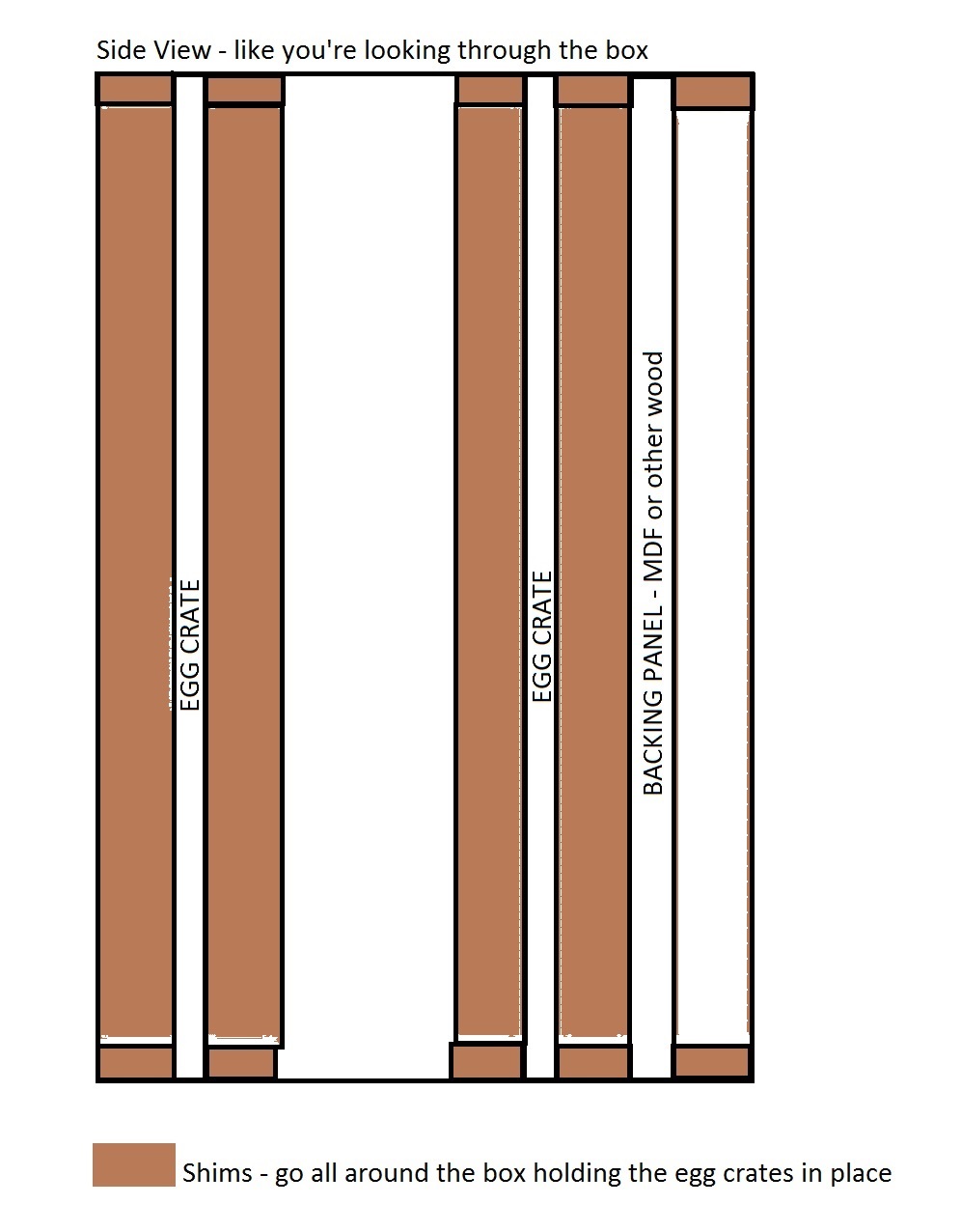 Then build a box using wood panels that are at least 6″ wide (the box is 6″ deep all around). At this point, you’ll just have the frame of the box (sides, top and bottom). (I measured the panels on my box to be 7 1/4″ from the front of the unit to the back of the unit) with some dead space in the back, that’s why I suggest using wood panels that are 6″ wide. You want the markers to sit flush with the front of your storage unit but not sticking out too far or sitting too deep inside the unit. The dimensions of the frame will be dependent on how many rows and columns you decide to make your unit. Add two rows and columns to account for shim space. Cut two crates exactly the same. It’s important that they align just right so that you can slide a marker in and out without it catching. You’ll have to decide how far back you want your markers to sit. This is where you’ll place your backing (MDF board or plywood, or any other flat board) as a stopper for the markers. So you’ll have 5 sets of shims to hold each egg crate and the backing in place – thin pieces of wood at the front and back of each crate and the MDF board to hold them in place. They can be long pieces running all around the inside of your boxed frame or just several short pieces on each side of your box. You can use wood glue or screws to secure them in place. This was how we created this box. If you think of a better way to hold your egg crates and backing in place, go for it!