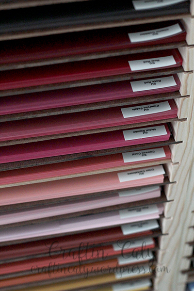 DIY Paper HolderI now store my paper horizontally in two tall units that my husband built for me. I was perfectly happy with how it was stored before, but my husband had an itch to build – so I let him – and I’m happy with how it turned out :). As far as scraps go, I’ve always stored them in a plastic file box, separated by file folders. But I saw Carissa Wiley’s paper organization video and I thought it was genius to use sheet protectors to store scraps – why hadn’t I thought of that?!? I kept trying to think of how I could store my scraps with my full sheets and this is it!