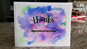 On the first card she made, we used some zig clean color markers to create a background and embossed the sentiments in black. She chose the colors for the background – I have to admit – I would not likely put these colors together but I think it turned out great and I need to be more like Rachel!