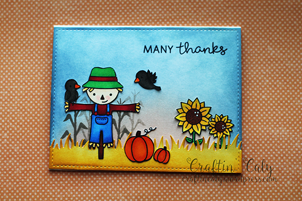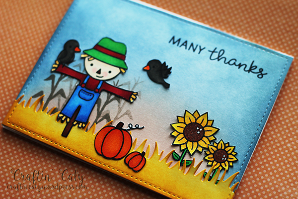 I used some Sakura Gelly Roll pens to highlight the eyes and to add white accents to the sunflowers. I also added some Wink of Stella Clear shimmer to the flowers and pumpkins. I hope you like this card!