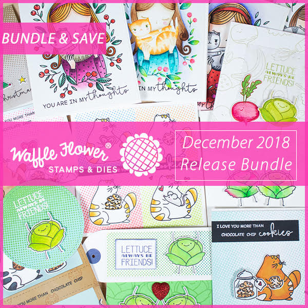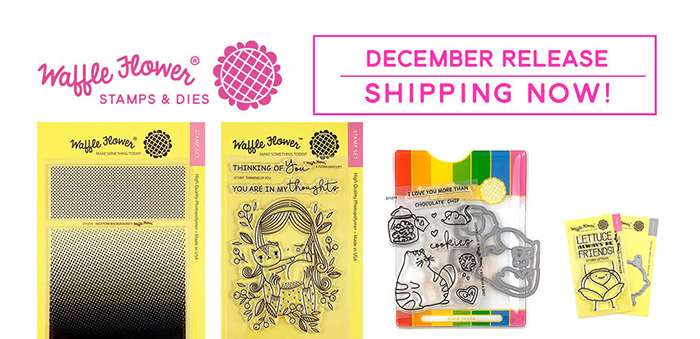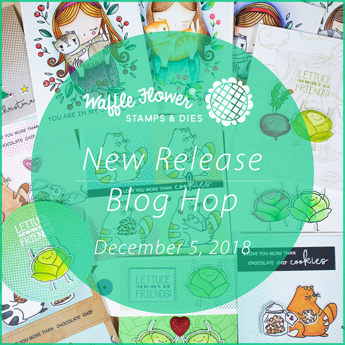Hello and welcome to the Waffle Flower December Release Blog Hop! Waffle Flower’s 2018 December release is sweet and simple. Halftone Background stamp set features a gradient of dots that can be overlapped and stamped in two colors to create the look of a blended background. In this release you will also find the lovely Thinking of You stamp set featuring the same girl from the Always stamp set hugging the cutest cat ever. The Cookie Love Stamp Set (stamp, die, combo), illustrated by Big Bear and Bird, is perfect for anyone wanting to send some love or get a jump on their Valentine’s cards! And the 2×3 Lettuce stamp set (stamp, die, combo) offers a cute punny greeting for a friend.