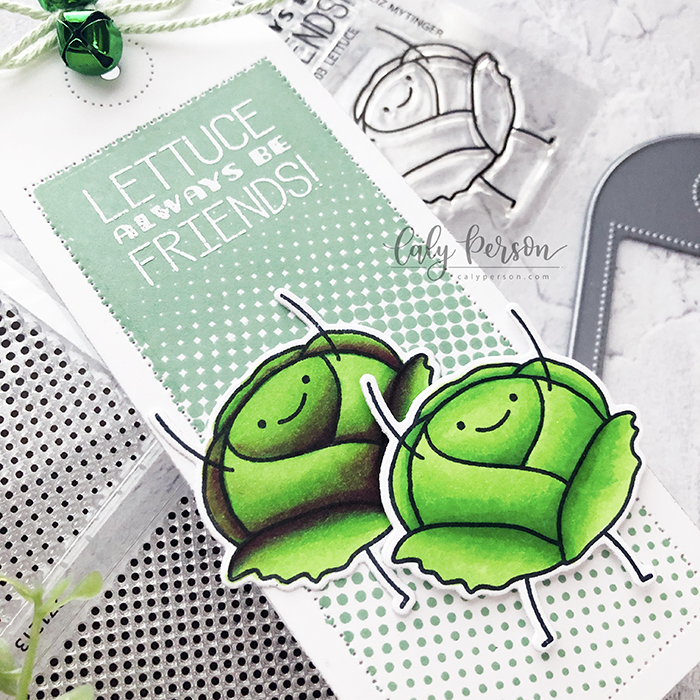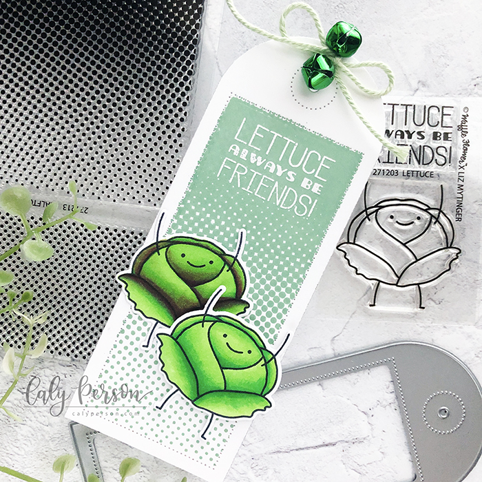 I stamped and colored the lettuce images using the following Copic markers: YG05, GY09, G09, RV69. After cutting the images out using the coordinating Lettuce Die, I adhered them to the tag using foam tape to add dimension on the top lettuce friend.