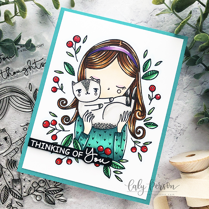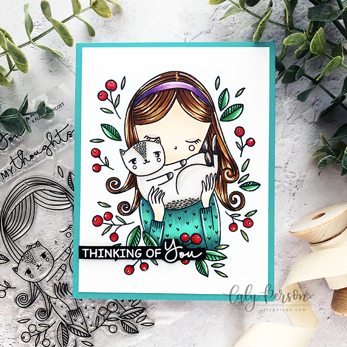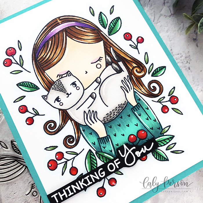 I trimmed the colored panel to a 4″ x 5.25″ panel to mat an A2 sized teal panel to match the sweater on the girl. To finish off the project, I embossed the sentiment from the same stamp set on black cardstock using white embossing powder. I cut the sentiment strip down and adhered it to the card using foam tape. As a final touch, I added some shimmer to the berries, her eyelids and headband using Wink of Stella.