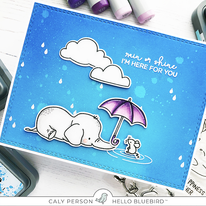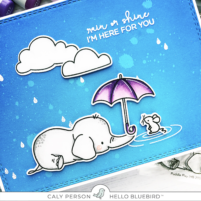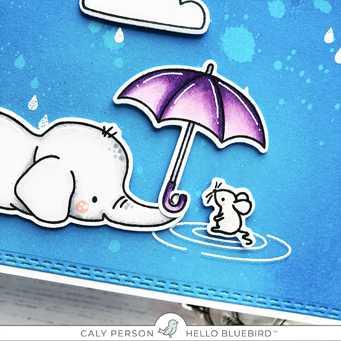 I stamped and colored the images using Copic markers: V01, V12, V15, V17 (umbrella – you really don’t need 4 markers to color a tiny umbrella…I get a bit wild with it sometimes), W0, W1 (mouse), T0, T1, T3 (elephant) , C00, C1, C4 (clouds and umbrella), R20 (blush). Then I die-cut the images and set them aside while I worked on the background of the card.