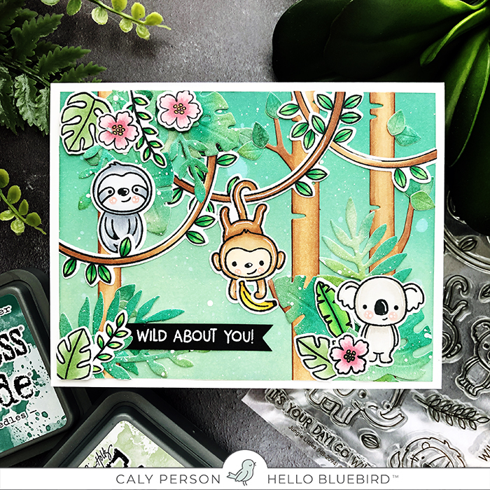 Finally, it was time to assemble! I started first by adhering the birch trees to the ink-blended panel. Then I added the little watercolored leaves, jungle vines, and tropical foliage. Where there was lots of layers, I used foam adhesive to balance things out. Then I adhered the sweet animals to the card in various areas and trimmed the card down to mat an A2-sized card panel. For the sentiment, I stamped and embossed over black cardstock and tucked one end behind the foliage.