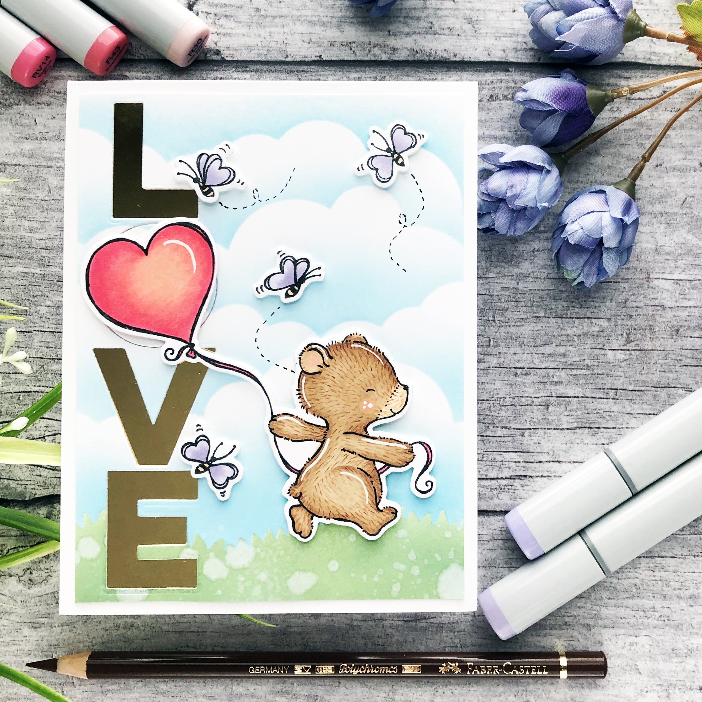 Once the background was created, I used the vertical Double the Love die to die-cut the word love. I in-laid the letter “O” knowing I wanted to use the particular bear image above holding a balloon to take the place of the letter. I backed the letters with Gold Foil Specialty Cardstock by My Favorite Things.