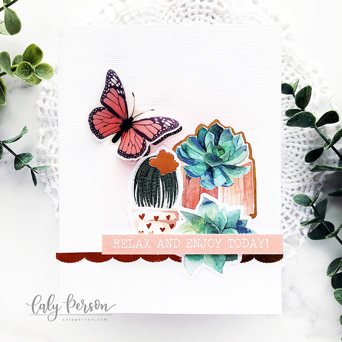I love the scallop foiled border on this card and potted succulents. Once again, I added a 3D sticker butterfly as a final touch.