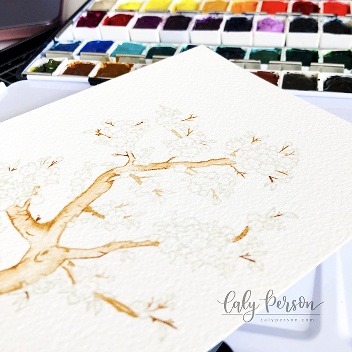 It’s sooo very detailed! I used a no-line coloring ink and it’s sooo difficult to see what I was painting but I tackled it by going very slow, and referencing the stamp a lot. I actually started by painting the tree trunk and limbs first. Seemed most obvious to me.
