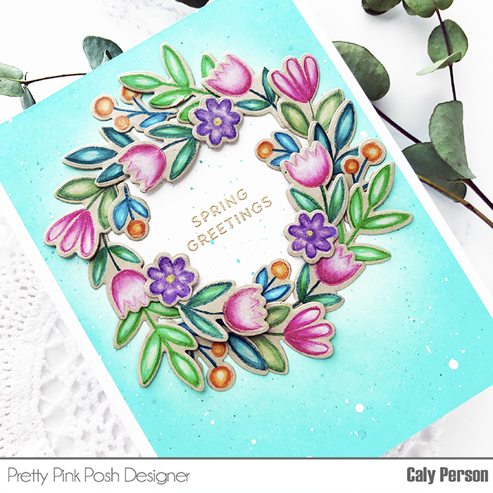 For today’s card, I used the new Spring Wreath stamp set. The stamp set comes with a wreath already formed, but I used the individual images to create my own wreath for this card. I stamped my images on craft cardstock using white pigment ink to begin coloring. I started with a base of white colored pencil, then added medium and dark colors, and blended again with white if I needed to to create highlights on each flower and petal.