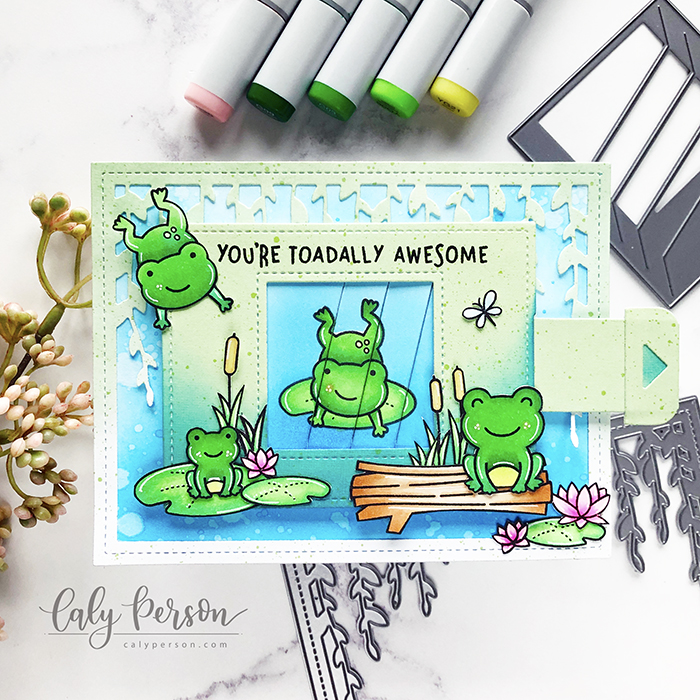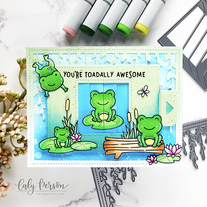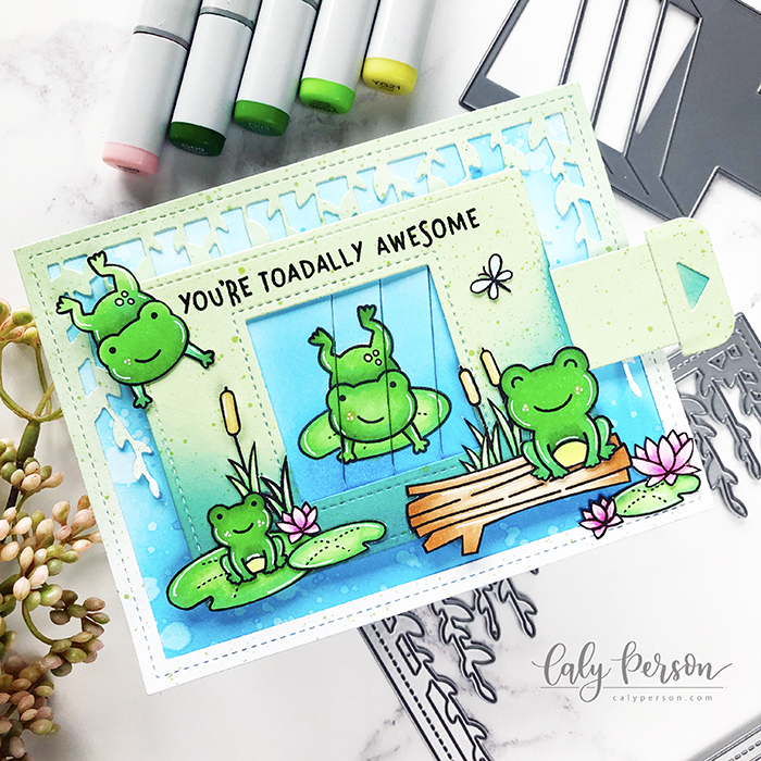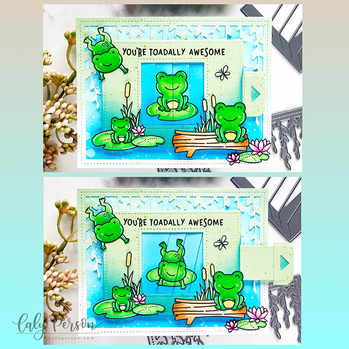 I started my toad out on a lily pad and decided to have him hop off for the “after” image. After coloring these images with Copic Markers, I masked and ink-blended around the images with Salty Ocean Distress Oxide Ink. Then I used the interactive die to cut out my images and create the mechanism. I used the Spiffy Speckles patterned paper to decorate the mechanism and ink-blended with more ink at the bottom to give it the look of blue water.