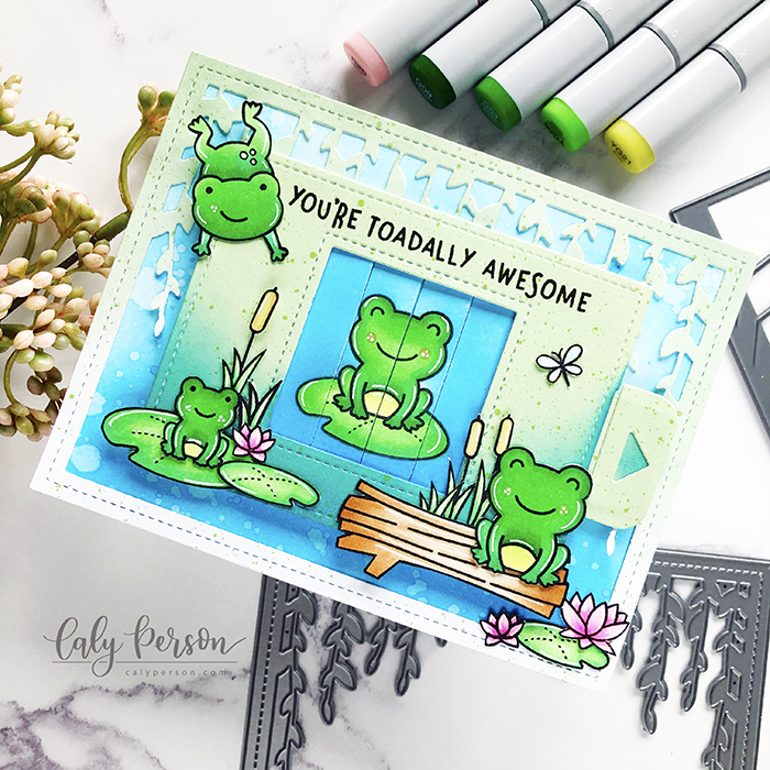 Oh Caly! This is sooo beautiful! These sweet frogs can make wonderful pets with those cute smiles for sure! Your scene is fantastic…I specially love the colors! We’re so happy you are sharing this cutie with us, thank you so much for playing along at the Lawn Fawnatics Challenge! -Grace…what a cute doggy! Hope everything goes good with him! 🙂