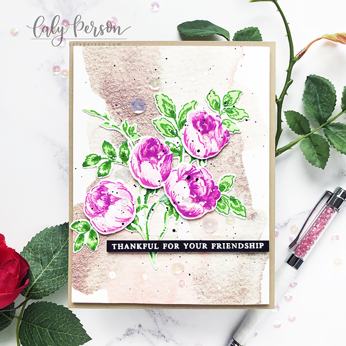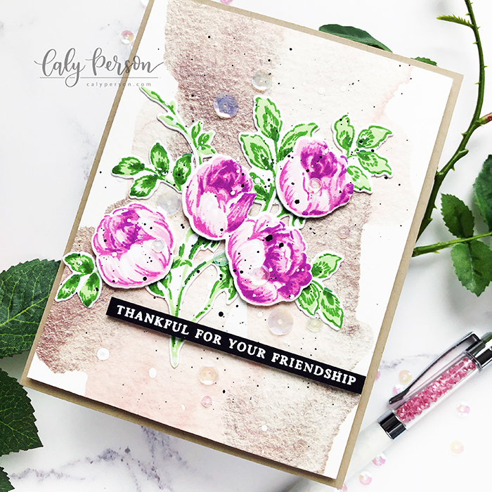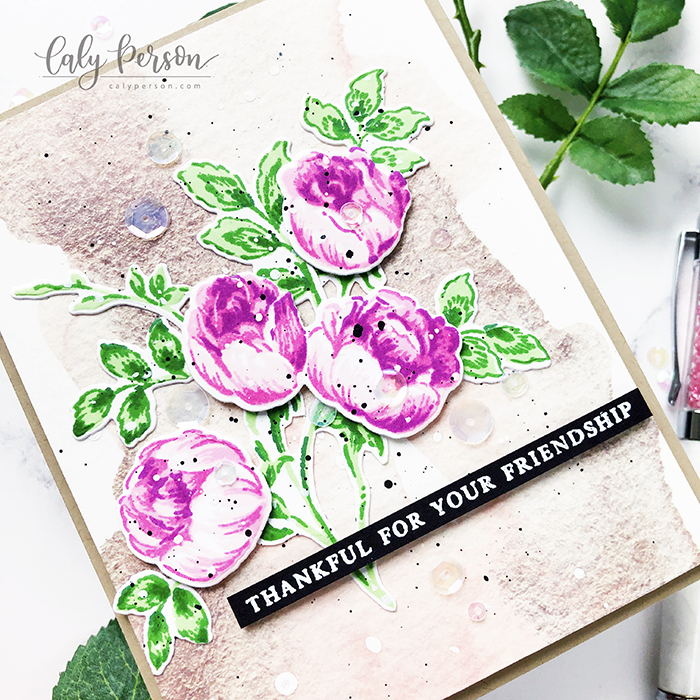 The Sweet Rose Bouquet flowers  and foliage are stamped with Altenew ink (Firefly, Grass Field, Shadow Creek, Mountain Pine, Rose Quartz, Puffy Heart, Purple Wine, and Cosmic Berry). After stamping, I die-cut the images and splattered both the background and images with white and black ink to give it extra interest.