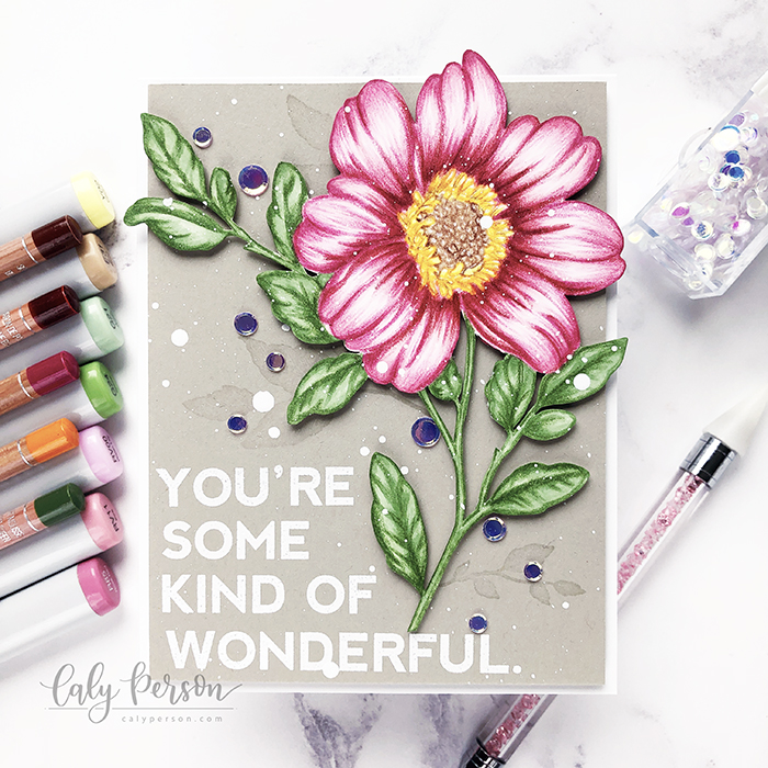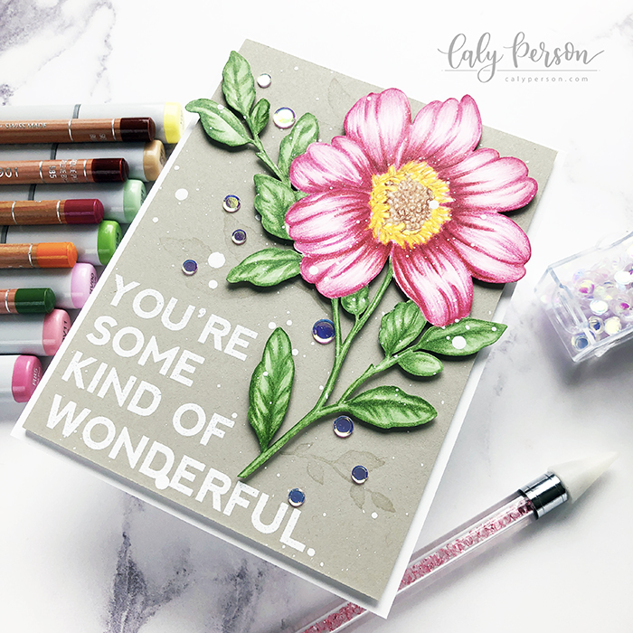 On a piece of light kraft cardstock, I embossed the sentiment from this stamp set in white – and added a few watermark foliage images in the background before adhering the colored image on top using foam adhesive for dimension. It casts a subtle natural shadow and I love the height. Then I splattered the whole thing with white acrylic paint. CRINGE…I just never know if the splatters will be as exactly as I like them…but it works out if you love messy imperfections! There was no turning back for me – I had spent way too long on this card at this point to NOT be ok with it! To finish the card, I added some iridescent sequins. This is one of my favorite cards of all time! I’m so glad I tried no-line Copic coloring with colored pencil accents! I hope you enjoyed it!