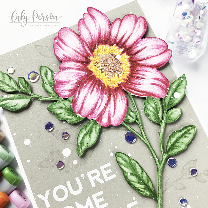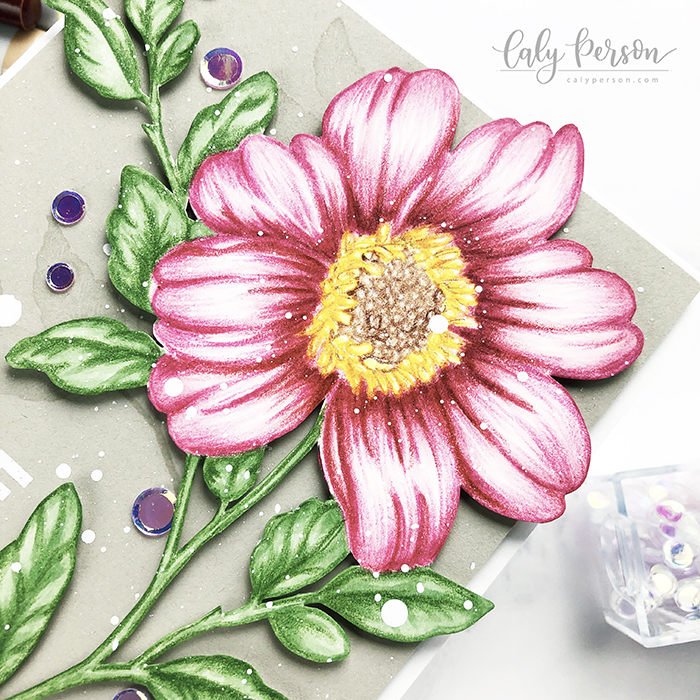 After coloring with the Copic markers, I highlighted each flower petal and leaf petal with colored pencils. Sometimes, Copic markers don’t get the details like colored pencils can and I definitely wanted details to pop on this card.