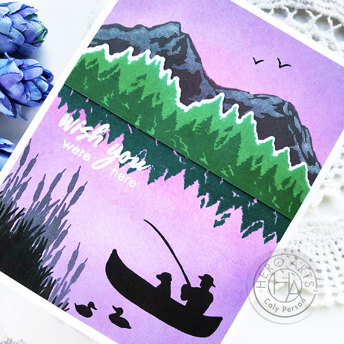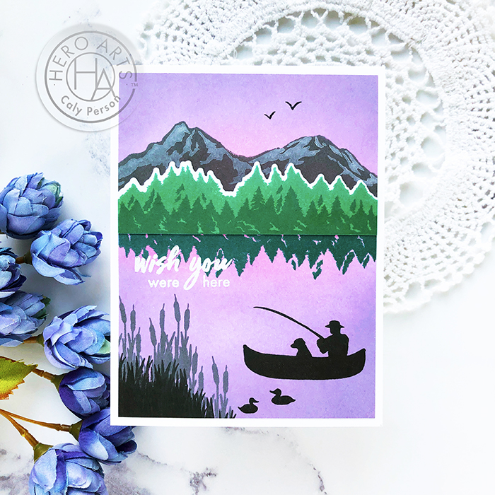 The background is ink-blended with the tree line being the starting point using Soft Pink ink, Soft Lilac, and Soft Purple (lightest in the center; darkest towards the outer edges. When I was done ink-blending, I decided to add a tree line reflection and then a mountain background using Charcoal Ink. The second layer of the mountains is stamped with Pigment White Unicorn ink.