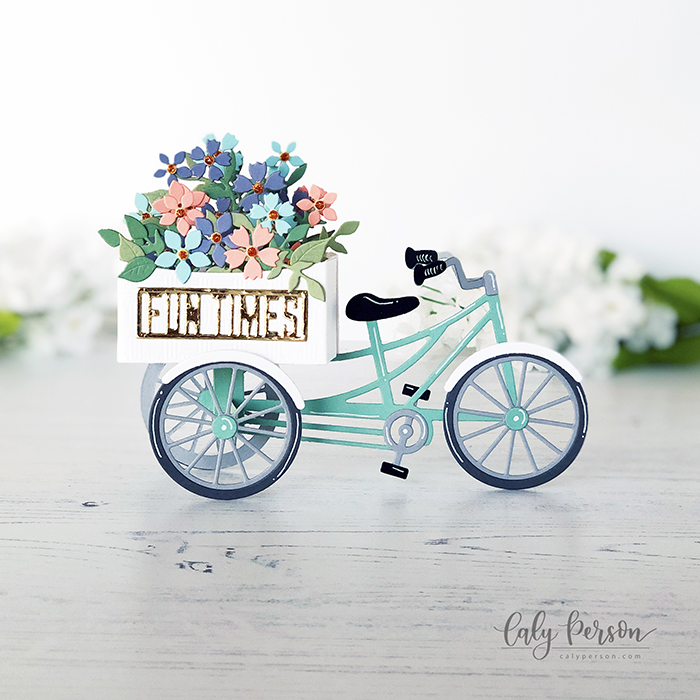 After constructing my bike, I used more flowers and foliage to form a floral spray behind my basket in the same way as my 3D bike, except in a single layer. To bring in the Glimmer Hot Foil Kit of the Month, I foiled the sentiment from this month’s kit over white paper using Pewter foil.