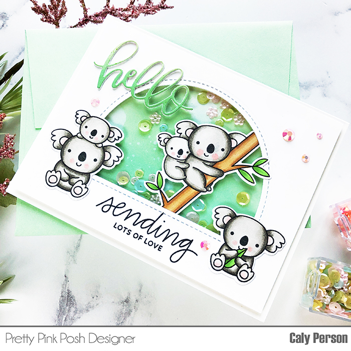 I’m here today to share a Pretty Pink Posh shaker card using the Koala Friends stamp set. I’ve used this set a few times now because I adore it! To make today’s card, I started by stamping and coloring my koala images using Copic markers (YG07, G03, G05, E31, E34, E25, W1, W3, W4, W5, W7, and R20).