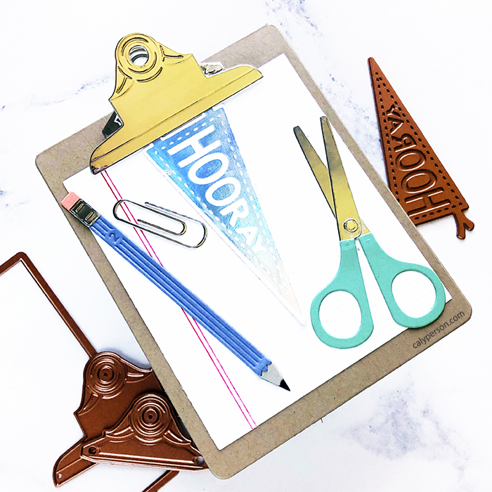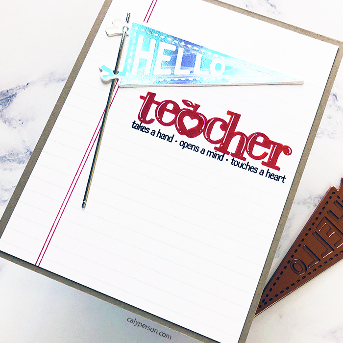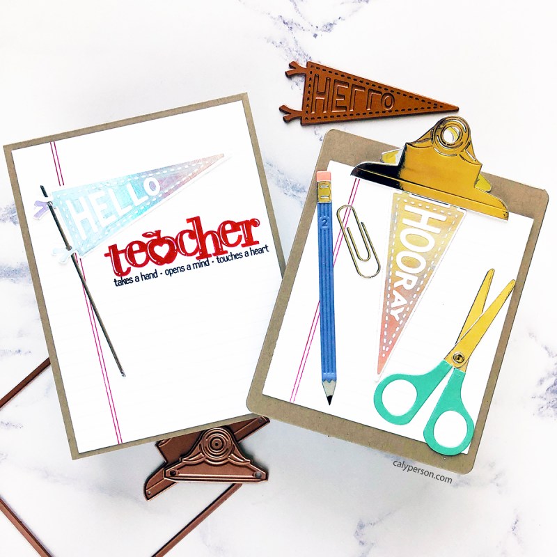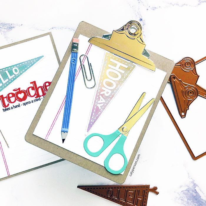 I then foiled my glimmer hot foil plates using the Prism foil and used one on each of my cards. I added the Hello flag to my teacher card and “clipped” the Hooray banner/pennant to my clipboard for the student card to commence school starting.