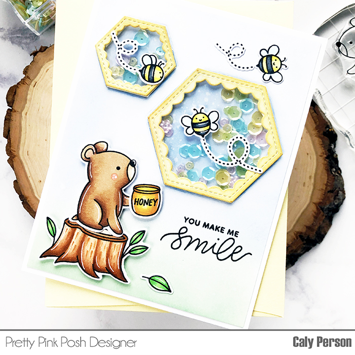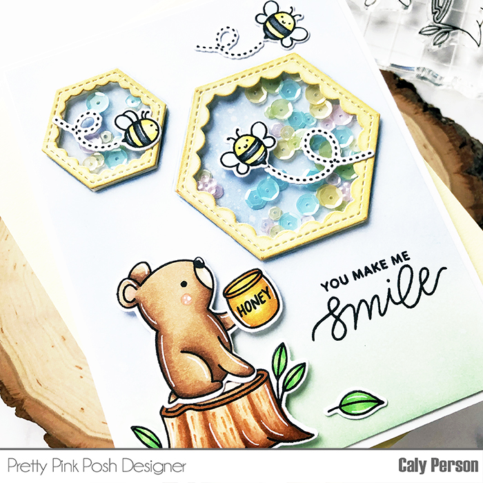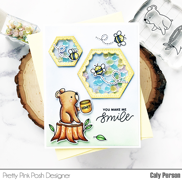 I’m sharing another shaker card today using Pretty Pink Posh products. Bear Friends is a set from the previous release that I have not yet used. So I’ve combined it today with the Bee Friends set because I couldn’t resist doing something with the honey jar.