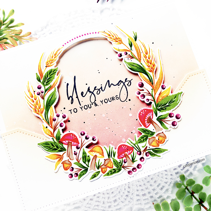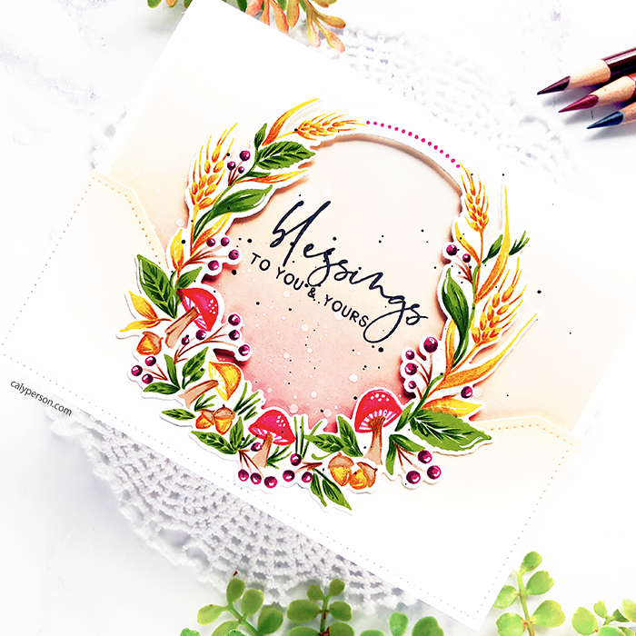 I’ve made a card from the Bountiful Wreath set. I stuck with a fall color palette, but think it’s possible to create seasonal wreaths as well depending on the colors you choose. This is a 5-6 step stamp and allows you to incorporate so many different colors to create this “one-layer” wreath. I used various dye ink colors to stamp my wreath.