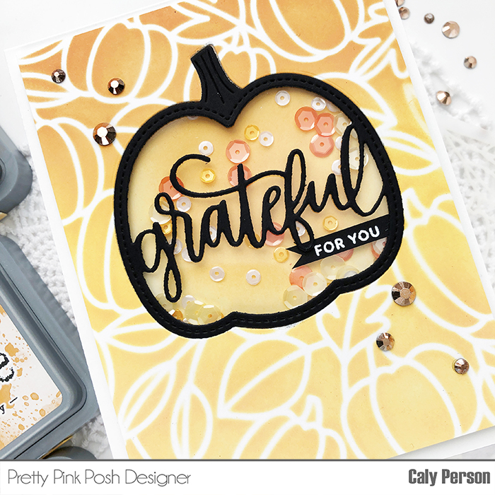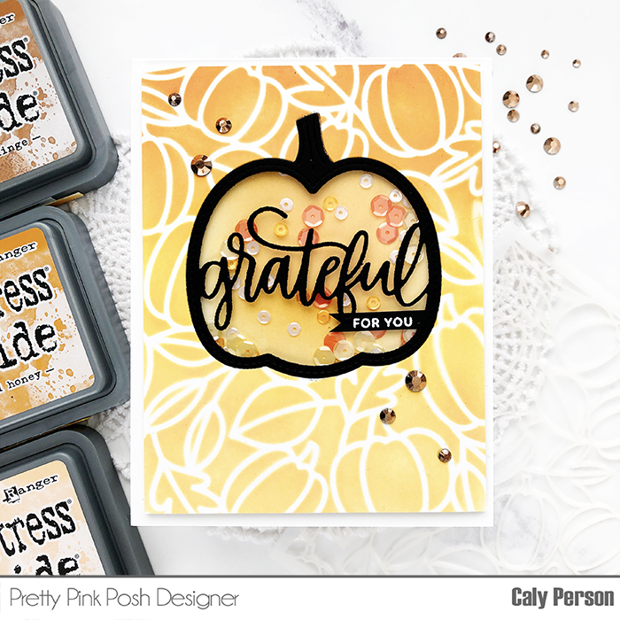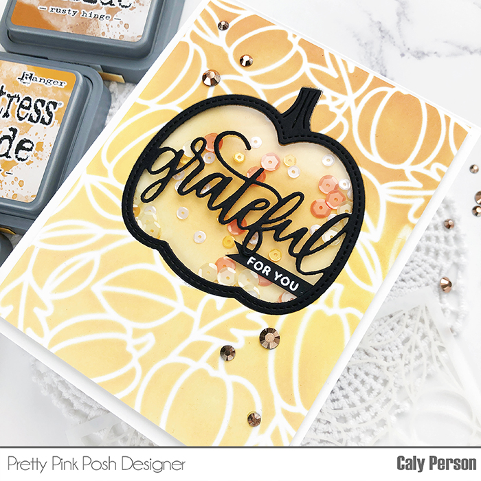 I’m stopping in with a quick shaker card that I made using two Pretty Pink Posh fall products – the Grateful Shaker die and the Pumpkin Background Stencil.