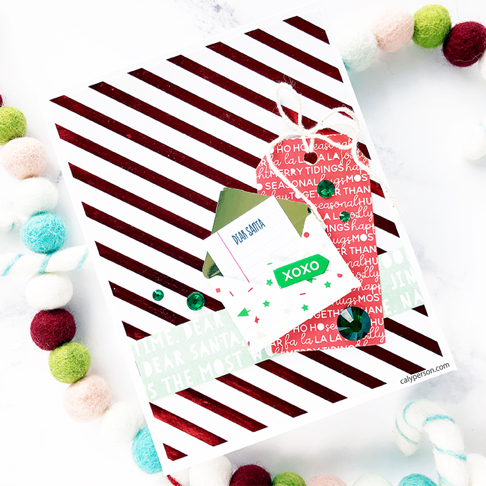 I wish you could see the foiled vellum better on this card. It’s beautiful! I layered different pieces to create this card – the green stripe is cut from patterned paper. The tags come in 4 different patterns and the envelope with Santa note is a sticker. It’s so fun to put all these elements together. Once again, I finished by adding some gems on the card.