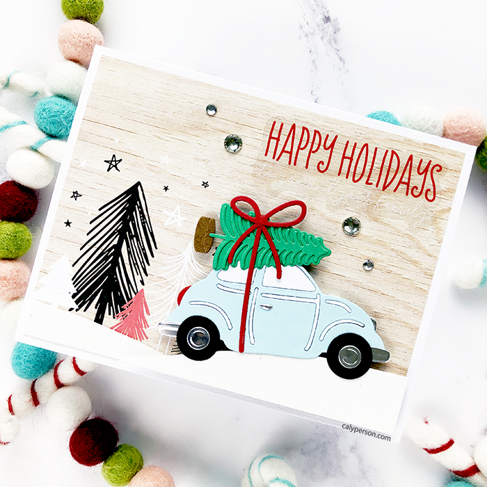 The die not only cuts the car, but also the big bow and tree. There is sparkling white paper that I used to cut the hills and the background with it’s trees is a piece of patterned paper! I used the Happy Holidays sticker that comes with a clear backing for my sentiment and decorated the background with some gems.