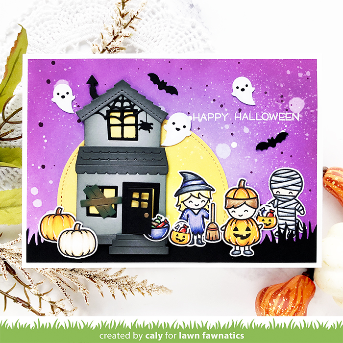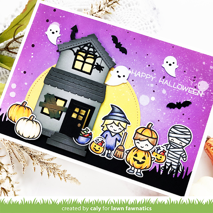 I’m not great with color challenges – but I definitely enjoyed creating a halloween scene for this challenge! My card today is a 5″x7″ card. The house fits great on an A2-sized card, but I couldn’t fit all my costume party buddies so I decided to make the card a little bit bigger.