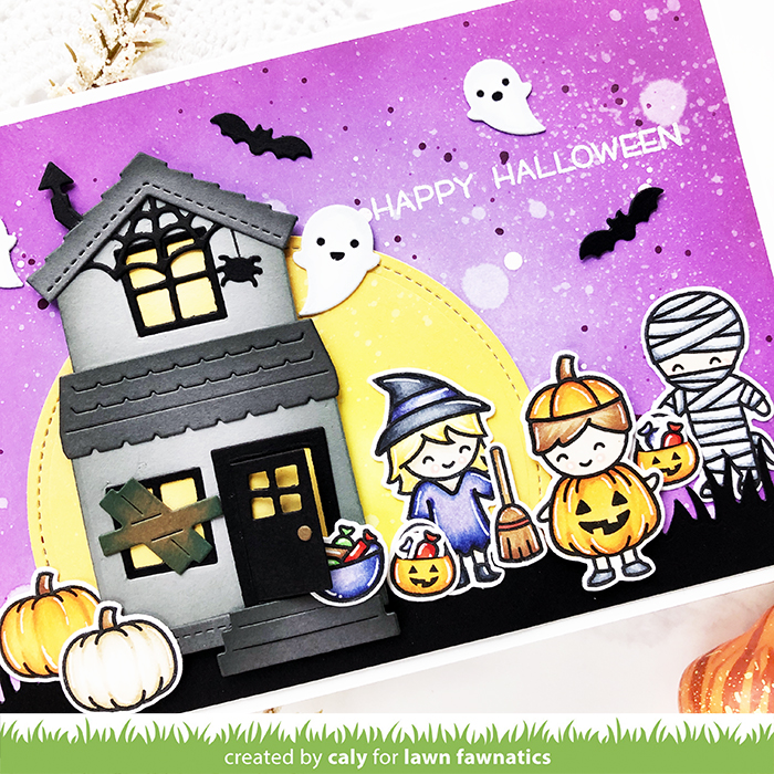 To start, I stamped and colored my images from the Costume Party stamp set using Copic markers. After coloring, I die-cut my images and added white gel highlights to the images. I set my images aside and began constructing my halloween house using the Build-A-House die and the Halloween Add-On. I used Lawn Fawn cardstock (Black Licorice, Storm Cloud, Narwhal, Paper Bag, Sticky Note) and ink-blended with Distress Oxide Inks (Wild Honey, Black Soot).
