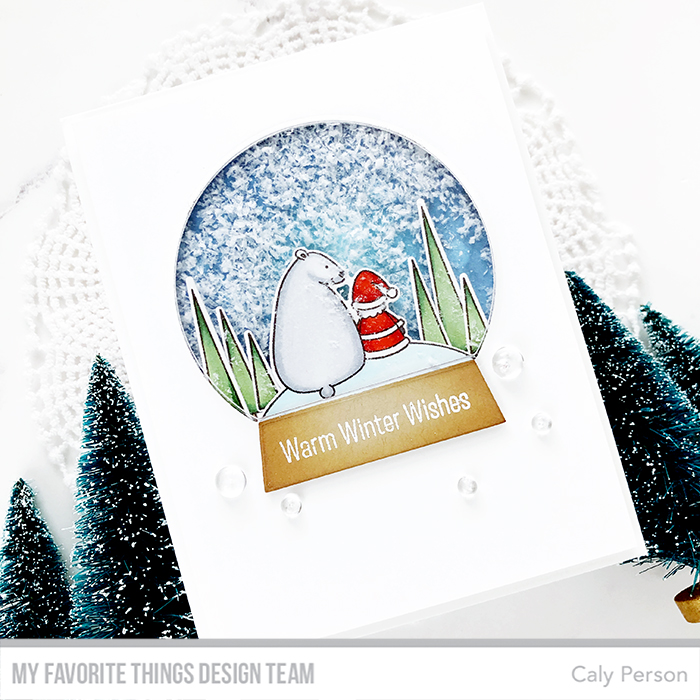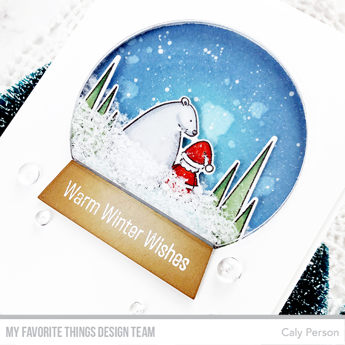 I adhered all of my images to the inside of my globe towards the bottom where it meets the paper. To seal the images in place, I die-cut the dome once more using craft foam. This gives the shaker more room and adds more space between the image and the background. On a top-folding card base, I ink-blended Broken China and Faded Jeans Distress Oxide Inks and splattered it with some water and lots of small splatters of white ink for snow.