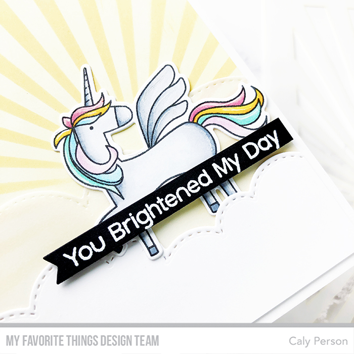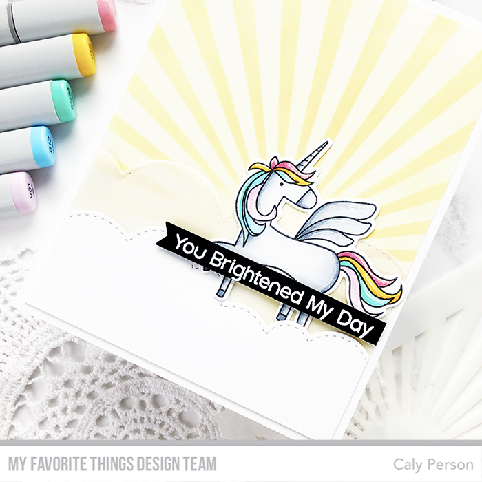 I stamped and colored my unicorn using Copics (C1, C3, C5, RV11, R85, Y15, Y38, BG11, BG34, B00, B12, V000, V01). I added some shimmer to the hair and then die-cut the image as well as the cloud borders.