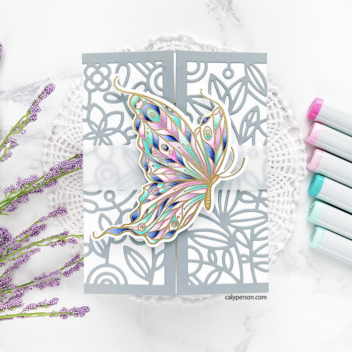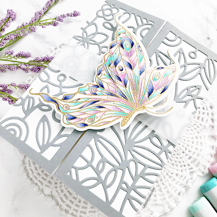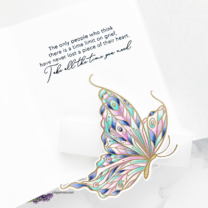 The Forever In Our Hearts stamp set focuses on a beautiful single butterfly image. For today, I made a neutral card and used my colored butterfly to create a simple belly band. I embossed my butterfly in gold and colored with Copic markers.