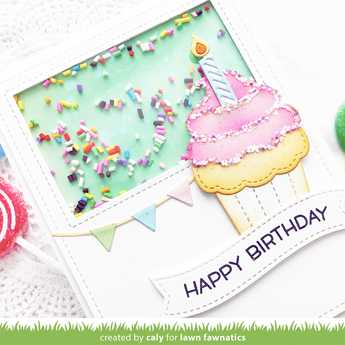 I used Spiffy Speckles patterned paper for my Stitched Cupcake and hanging pennants from the Scalloped Box Card Pop-Up Box today. Then I ink-blended around the edges with Picked Raspberry and Gathered Twigs Distress Oxide Inks to give the images more color and depth. Everything is die-cut except for the stamped sentiment on the banner. To create the top panel, I used the Outside In Stitched Rectangles to first cut the full panel, and then a smaller rectangle to cut the top window.